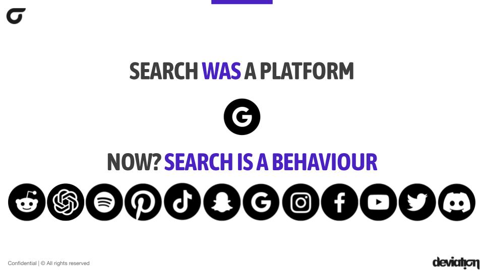 It recognises that modern audiences no longer rely on a single search engine to find answers, products, or inspiration. It acknowledges that search was a platform but that has now shifted, and search is now very much a behaviour.
